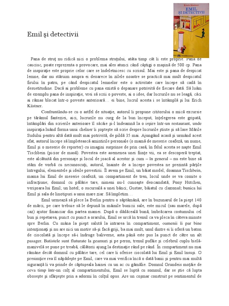 Emil și detectivi a fost o carte foarte interesantă are multă aventură. Cumpara acum, 100% sigur prin garantia de livrare. Este cea mai cunoscută carte pentru copii a scriitorului, o replică a romanului polițist în literatura pentru cei mici. În cele 167 de pagini ale cărții este descrisă viața unui băiat pe nume emil care strânge mărci. Chestia cu emil a fost chiar și pentru mine neașteptată.