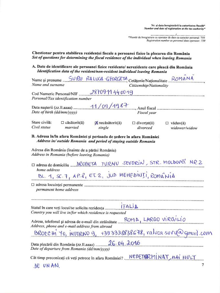 227/2015 privind codul fiscal, cu modificările și completările ulterioare. Chestionar pentru stabilirea rezidenei fiscale a persoanei fizice la plecarea din romnia set of questions for determining the fiscal residence of the individual when leaving romania a. Rezidenţei fiscale a persoanei fizice la plecarea din românia.