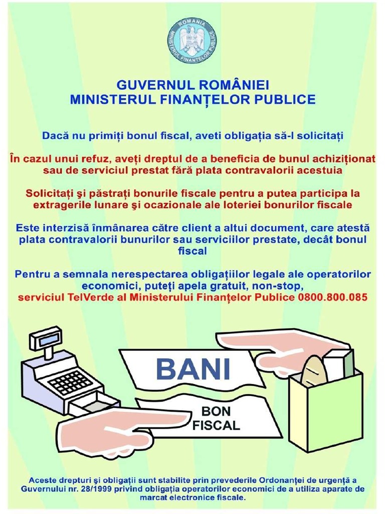 vizitati articolul complet aici : https://es.scribd.com/document/462924918/GUVERNUL-ROMANIEI De cateva zile, la ministerul finantelor publice se afla o misiune de audit a curtii de conturi pe tema celor doua rectificari bugetare pozitive de anul trecut, efectuate de guvernul ciolos, a anuntat, joi, daniela. Ministerul finanţelor publice se organizează şi funcţionează ca organ de specialitate al administraţiei publice centrale, în subordinea guvernului, care aplica strategia şi programul de guvernare în domeniul finanţelor publice. Ministerul finantelor publice 0800 800 085 telefonul consumatorilor infocons infocons.